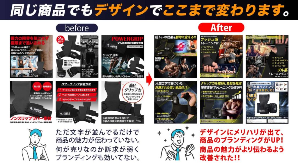 売れる商品画像を作るには、マーケティング理論に基づいた購買心理に刺さるセールスコピーやライティング、そして商品のポイントや魅力を瞬間的に伝えるデザイン力の2つが必要です。